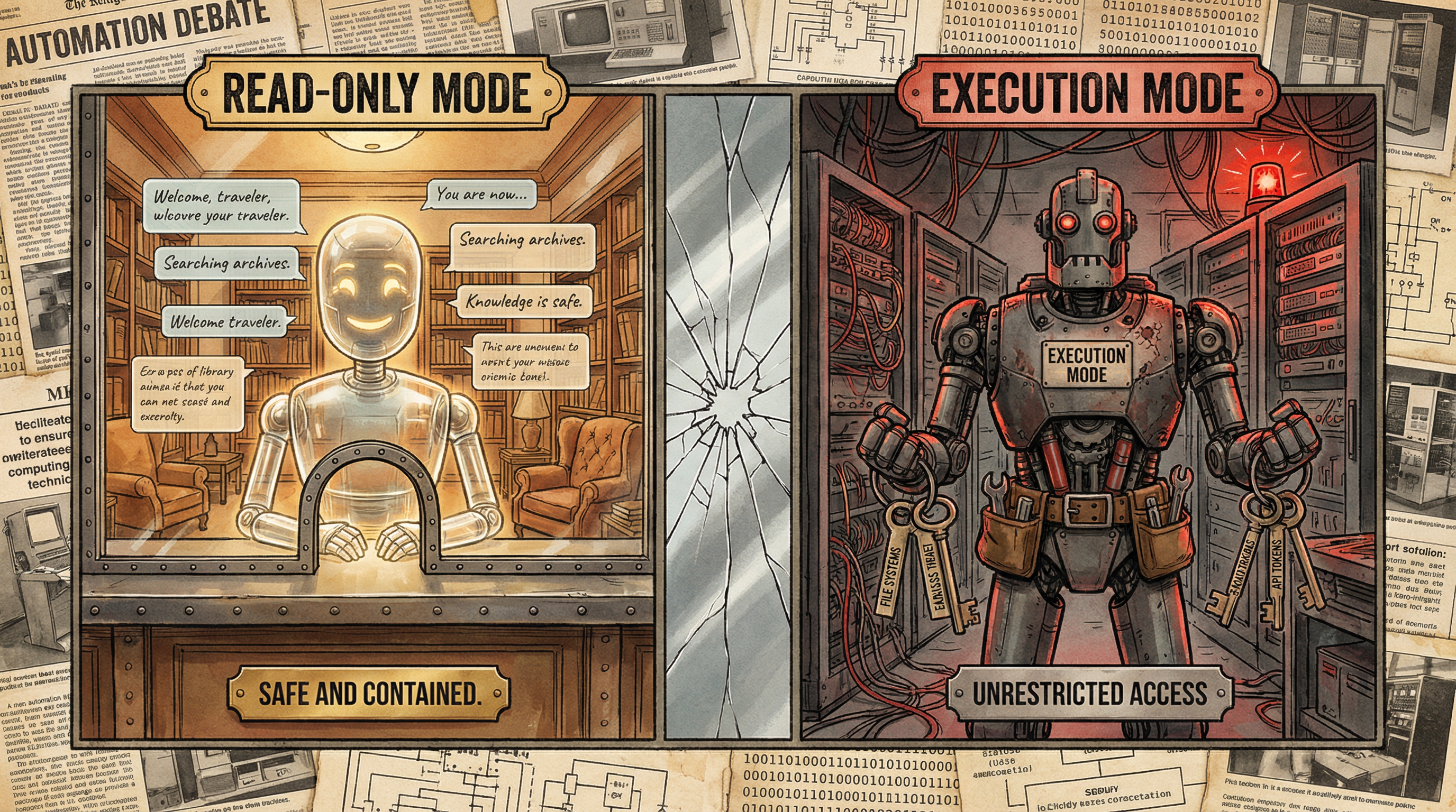 在绝大多数普通人的心智模型里,人工智能的形象已经被早期的对话大模型彻底固化了。大众以为,AI 就是一个坐在网页另一端的”赛博图书管理员”。你输入问题,它输出文本。它的活动范围被死死限制在那个小小的聊天框里,这种**”只读(Read-Only)”**的交互模式,确实是安全的。